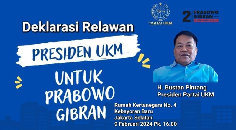 Presiden Partai UKM H. Bustan Pinrang menuturkan dukungan terhadap Prabowo-Gibran bukan tanpa alasan. Dia menyebut visi-misi pasangan itu sejalan dengan cita-cita relawan Usaha Kecil dan Menengah.