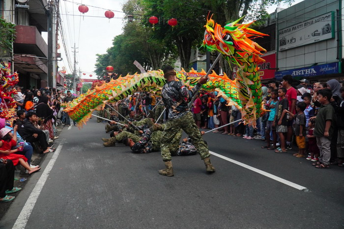 Magelang – Pasukan Barongsai Naga Guntur Geni Kostrad ramaikan puncak perayaan Imlek yang ditutup dengan Festival Cap Go Meh dengan tema “Imlek membangun persaudaraan sejati, menuju Indonesia Emas”, yang disaksikan oleh ribuan masyarakat dari penjuru Kota Magelang, Minggu (25/02/2024).