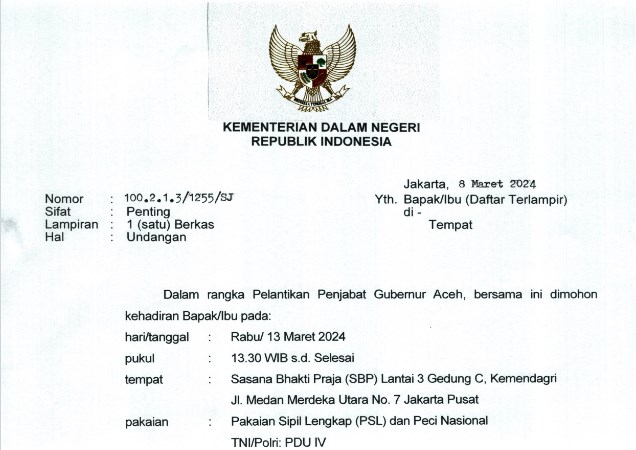 Banda Aceh, 8/3/2024 | Ketua Pengadilan Tinggi (KPT), Dr H Suharjono, SH, MHum merupakan salah seorang yang diundang dalam acara pelantikan Penjabat Gubernur Aceh pada Rabu, 13 Maret 2024 jam 13.30 WIB.