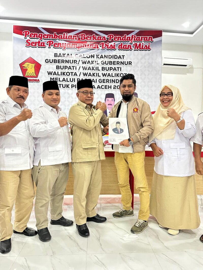 Banda Aceh: Suprianto resmi mendaftarkan diri sebagai calon Bupati Aceh Tamiang periode 2024-2029 melalui Partai Gerindra. Proses pendaftaran dilakukan di kantor DPD Partai Gerindra Aceh, di mana Suprianto menyampaikan visi dan misinya untuk masa depan Aceh Tamiang.Kedatangan Suprianto disambut oleh Mahfud Loktan, sekretaris tim penjaringan calon kepala daerah DPD Gerindra Aceh, beserta timnya. Suprianto, yang saat ini menjabat sebagai Ketua DPC Aceh Tamiang, juga merupakan Ketua DPRK Aceh Tamiang periode 2019-2024, menegaskan komitmennya untuk mengabdi kepada partai dan masyarakat.