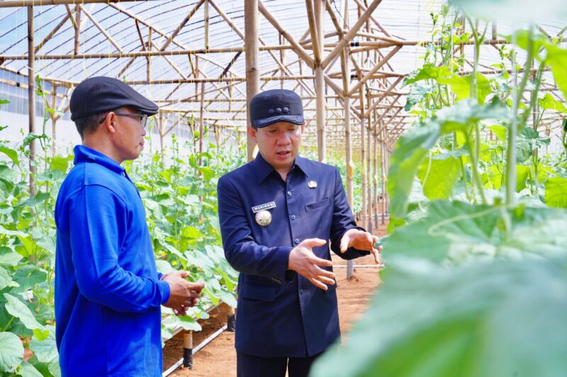 Penjabat (Pj) Bupati Pringsewu Marindo Kurniawan meninjau budi daya pertanian hydroponic di Pekon Margosari, Kecamatan Pagelaran Utara, Rabu (24/7/2024).