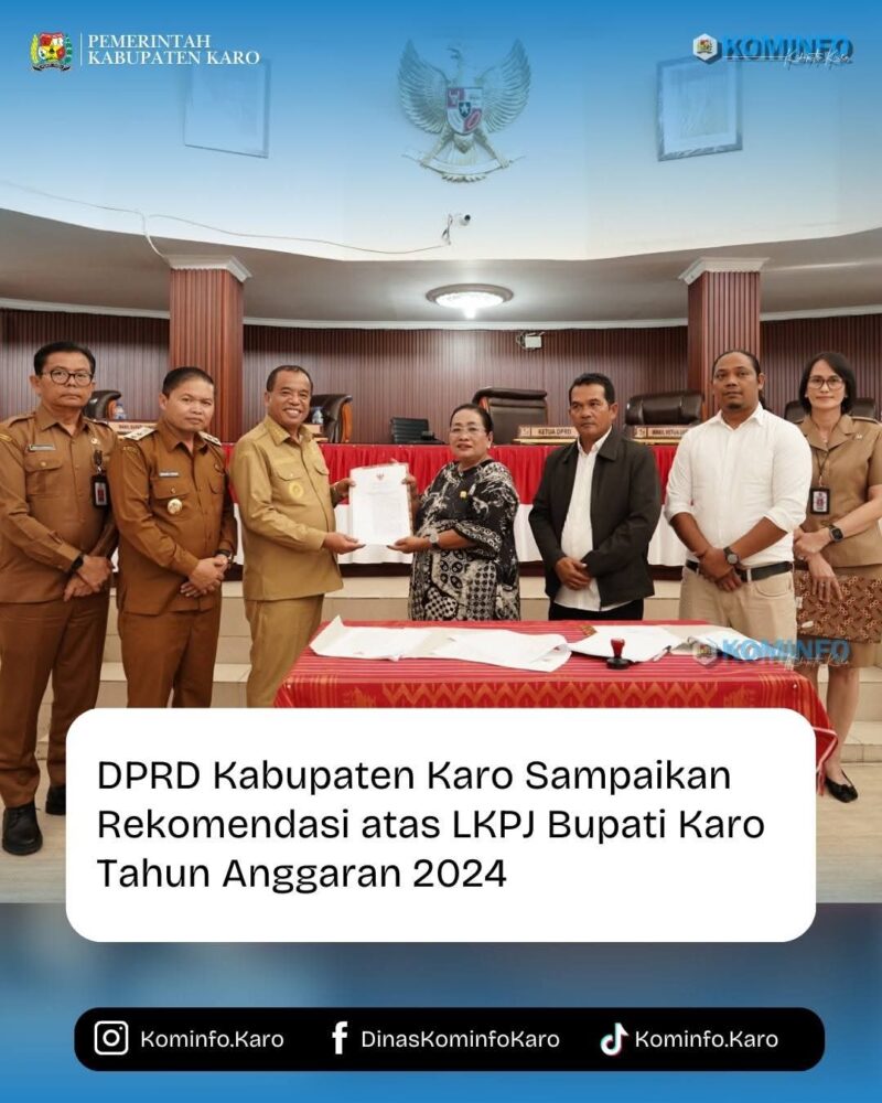 Dewan Perwakilan Rakyat Daerah (DPRD) Kabupaten Karo telah menggelar Rapat Paripurna dengan agenda penyampaian laporan Gabungan Komisi DPRD dan pengambilan keputusan atas rekomendasi terhadap Laporan Keterangan Pertanggungjawaban (LKPJ) Bupati Karo Tahun Anggaran 2024. Rapat ini digelar di ruang sidang utama DPRD Kabupaten Karo dan dihadiri oleh unsur Forkopimda, para pimpinan perangkat daerah, serta berbagai elemen masyarakat.