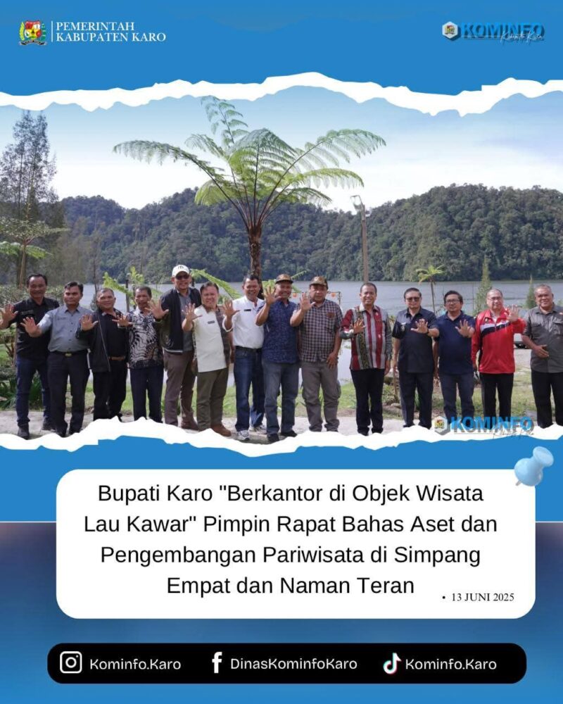 Rapat ini membahas pengelolaan aset daerah dan potensi pariwisata di Kecamatan Simpang Empat dan Naman Teran. Bupati Karo “Berkantor di Objek Wisata Lau Kawar” Pimpin Rapat Bahas Aset dan Pengembangan Pariwisata di Simpang Empat dan Naman Teran