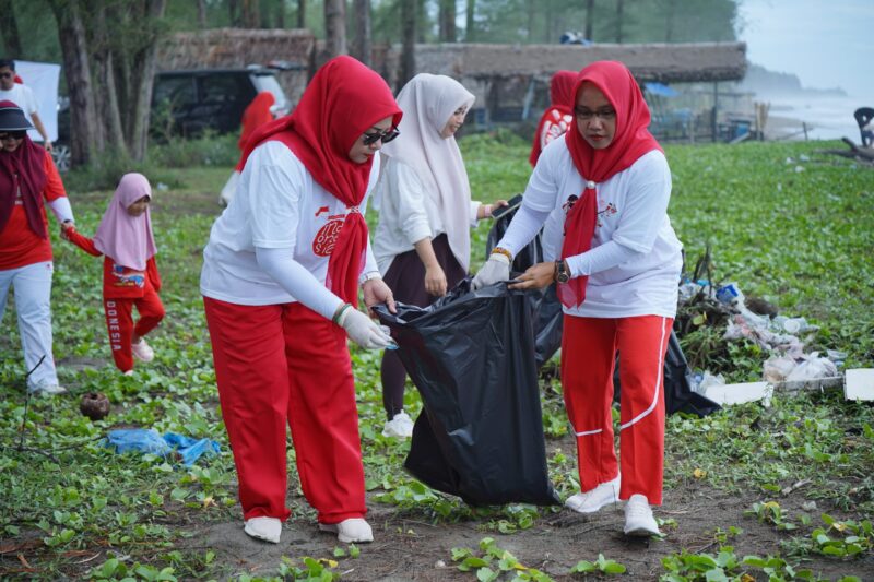 Suka Makmue : Menyambut peringatan Hari Ulang Tahun (HUT) ke-80 Kemerdekaan Republik Indonesia, Tim Penggerak Pemberdayaan dan Kesejahteraan Keluarga (TP-PKK) Kabupaten Nagan Raya melaksanakan gotong royong membersihkan Pantai Wisata Naga Permai di Gampong Lhok, Kecamatan Kuala Pesisir, pada Minggu (10/8/2025).