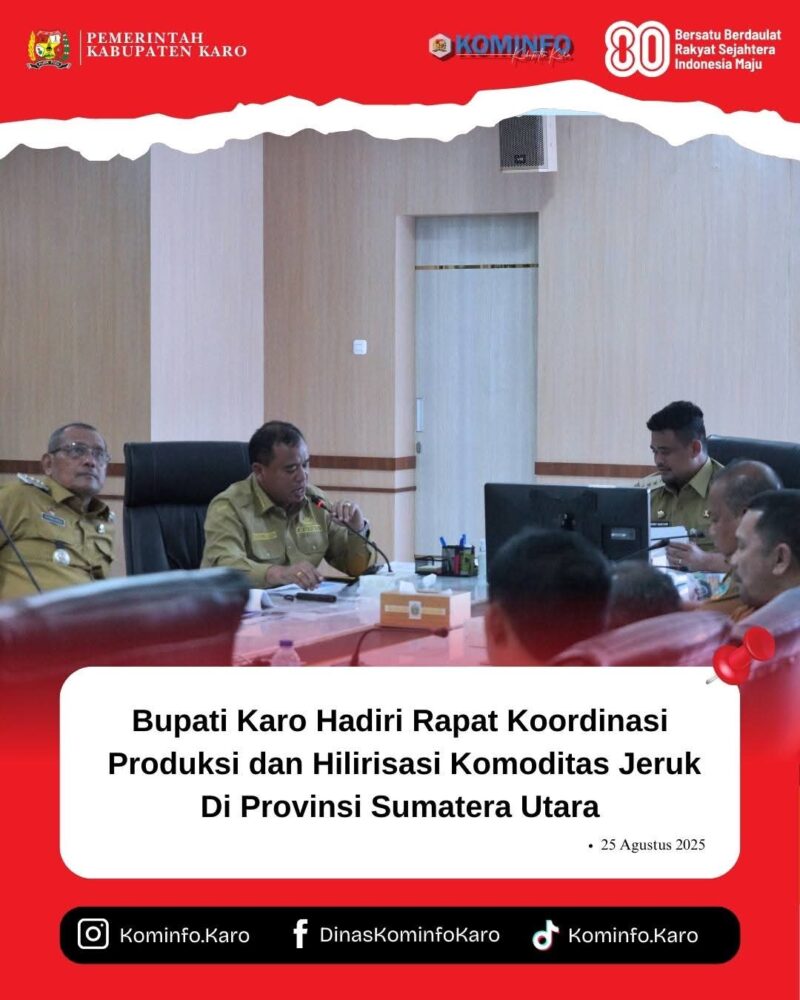 Digelar di Kantor Gubernur Sumatera Utara, Jalan Diponegoro Nomor 30, Medan pada Senin, (25/8/25). Bupati Karo, Brigjen Pol (Purn) Dr. dr. Antonius Ginting, Sp.OG., M.Kes., menghadiri Rapat Koordinasi Peningkatan Produksi dan Hilirisasi Pascapanen Komoditas Jeruk