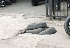 Bandung Barat, WaspadaIndonesia.com– Kondisi jalan masuk menuju Kantor Desa Padalarang, Kabupaten Bandung Barat, menuai keprihatinan. Jalan yang berlubang dibiarkan begitu saja, bahkan hanya ditutup dengan tumpukan ban bekas oleh warga sekitar sebagai penanda bahaya.
