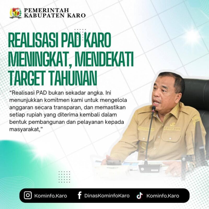 Realisasi Pendapatan Asli Daerah (PAD) Kabupaten Karo hingga September 2025, tercatat mencapai Rp102,86 miliar. Jumlah ini mendekati total realisasi PAD sepanjang tahun 2024 yang sebesar Rp105,11 miliar dan akan terus dipacu realisasi penerimaan PAD khususnya melalui OPD pengelola PAD pada sisa tahun anggaran berjalan.