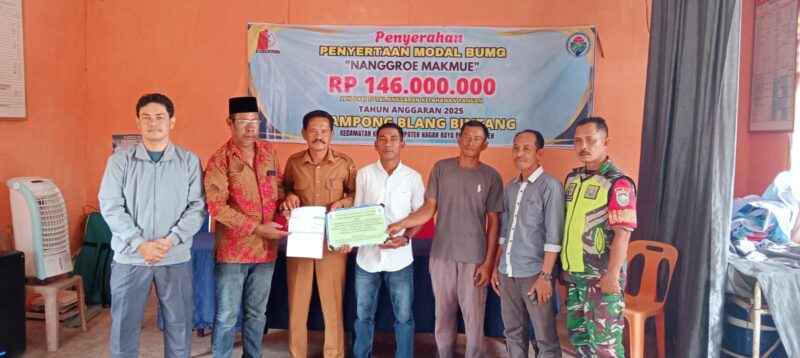 Penyerahan Penyertaan Modal Badan Usaha Milik Gampong ( BUMG ) Nangro Makmue dengan Total Rp .146.000.000 ( Seratus Empat Puluh Enam Juta Rupiah ) 20 % dari total Anggaran Ketahanan Pangan tahun Anggaran 2025. Gampong Blang Bintang Kecamatan Kuala Kabupaten Nagan Raya Provinsi Aceh.
