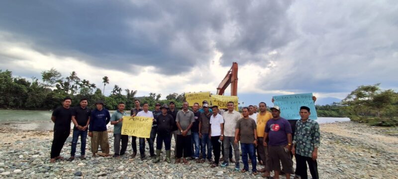 Aceh Barat : Warga dari sejumlah gampong di Kecamatan Pante Ceureumen, Aceh Barat melakukan aksi di pingir sungai Gampong Ketambang, Kamis (2/10/2025) siang. Aksi yang didominasi kaum wanita ini menolak ditutupnya tambang menggunakan beko/ alat berat excavator.