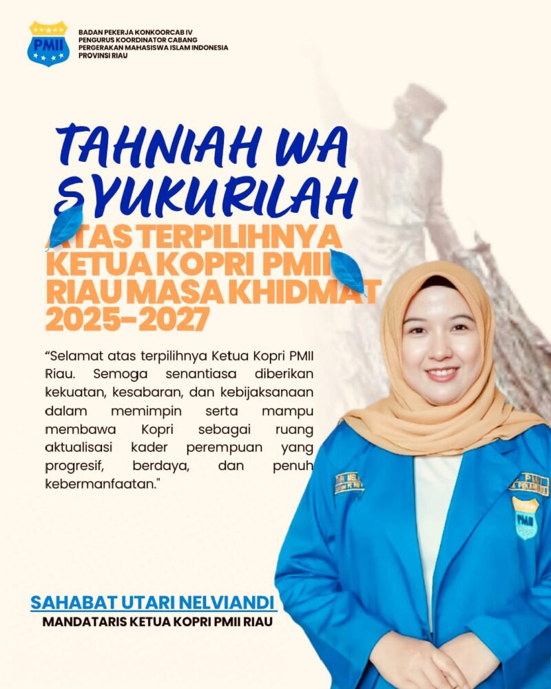 Utari Nelviandi, S.H., M.H., secara resmi terpilih sebagai mandataris Ketua Korps Pergerakan Mahasiswa Islam Indonesia (Kopri) Pengurus Koordinator Cabang (PKC) PMII Riau untuk masa bakti 2025–2027.