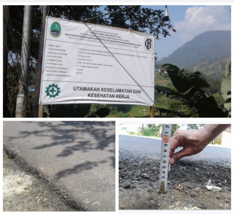 WASPADA INDONESIA . COM <> Bandung – Proyek pemeliharaan berkala jalan pada Ruas Jalan Banjaran–Pangalengan kembali menuai sorotan publik. Pekerjaan dengan nilai kontrak Rp14,49 miliar yang dikerjakan PT Purna Graha Abadi berdasarkan Paket Kontrak No. 75/PUPR.08.01/BM.6.4.2.2/PPK/PJJ/UPT-III/2025 tertanggal 25 Februari 2025, diduga jauh dari standar teknis yang dipersyaratkan.