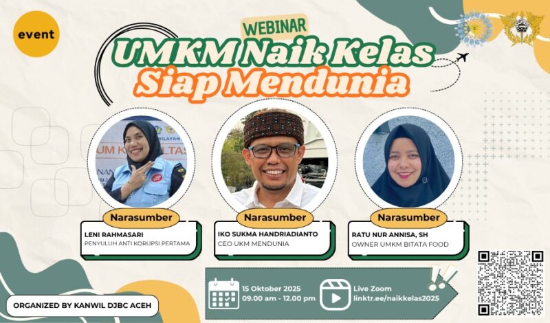 Banda Aceh, 06 Oktober 2025 — Di tengah era digital dan pasar global yang semakin terbuka, pelaku Usaha Mikro, Kecil, dan Menengah (UMKM) Indonesia memiliki peluang besar untuk berkembang dan bersaing di tingkat internasional. Namun demikian, tantangan yang dihadapi juga semakin beragam dan kompleks. Untuk membantu UMKM menghadapi tantangan tersebut, Kantor Wilayah Direktorat Jenderal Bea dan Cukai (DJBC) Aceh akan menyelenggarakan webinar bertajuk “UMKM Naik Kelas, Siap Mendunia” pada Rabu, 15 Oktober 2025 pukul 09.00 hingga 12.00 WIB secara daring melalui platform Zoom.
