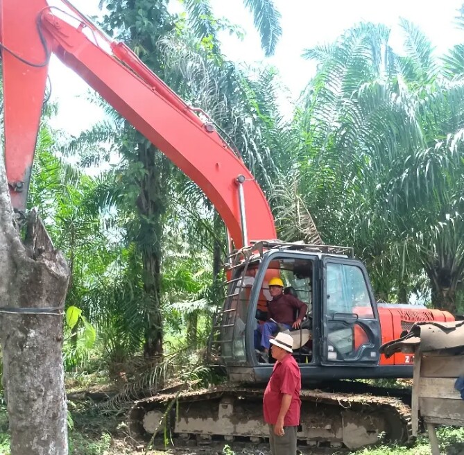 PT Socfindo Seumayam menurunkan satu unit Excavator merupakan peralatan serbaguna yang mampu menangani berbagai jenis pekerjaan saluran pembuangan atau selokan selokan.