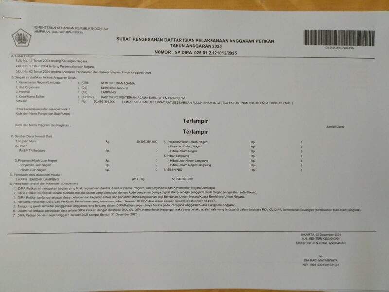 Sekretaris Jenderal (Sekjen) LSM Trinusa DPD Lampung, Faqih Fakhrozi, secara tegas menyatakan bahwa langkah ini didasarkan pada data Dokumen Isian Pelaksanaan Anggaran (DIPA) Petikan Tahun 2025. Ia mengungkapkan, Kemenag Kabupaten Pringsewu tercatat mengelola anggaran senilai Rp 50.496.364.000.