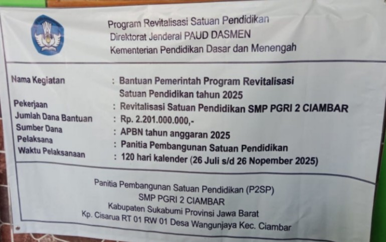 Sukabumi — Proyek revitalisasi SMP PGRI 2 Ciambar, Kabupaten Sukabumi, yang bersumber dari Anggaran Pendapatan dan Belanja Negara (APBN) Tahun Anggaran 2025 dengan total nilai Rp2.201.000.000, menuai sorotan publik. Proyek yang dilaksanakan dengan sistem swakelola itu diduga tidak sesuai dengan Rencana Anggaran Biaya (RAB) yang telah ditetapkan.