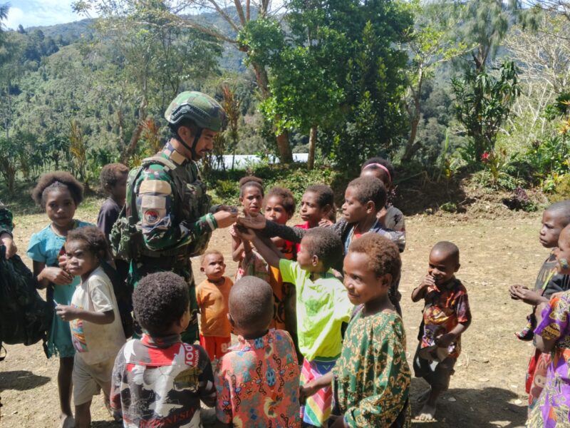 Intan Jaya – Papua Tengah.Waspada Indonesia | -Satgas Pamtas RI-PNG Mobile Yonif 113/JS TK Bilai menunjukkan kepedulian terhadap anak-anak di Kampung Bilai Distrik Homeyo Kabupaten Intan Jaya, dengan membagikan gula-gula/permen. Anak-anak Kampung Bilai sangat senang dan gembira ketika menerima gula-gula/permen dari personil Satgas. Kegiatan ini tidak hanya membawa keceriaan bagi anak-anak, tetapi juga mempererat hubungan antara Satgas dan masyarakat setempat. Rabu, 29/10/2025.