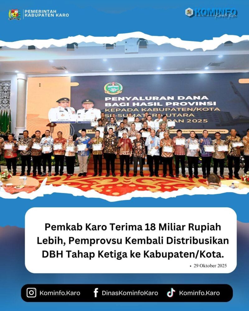 Pemprovsu Kembali Distribusikan DBH Tahap Ketiga ke Kabupaten/Kota, Pemkab Karo Terima 18 Miliar Rupiah Lebih