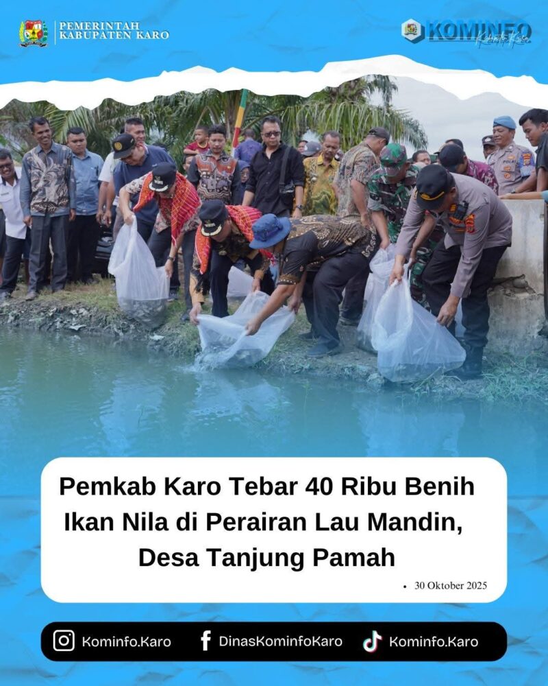 Pemerintah Kabupaten Karo melalui Dinas Ketahanan Pangan dan Perikanan melaksanakan kegiatan Restocking atau Penebaran Benih Ikan Nila di Perairan Umum Lau Mandin, Desa Tanjung Pamah, Kecamatan Mardingding, Kamis (30/10/25)