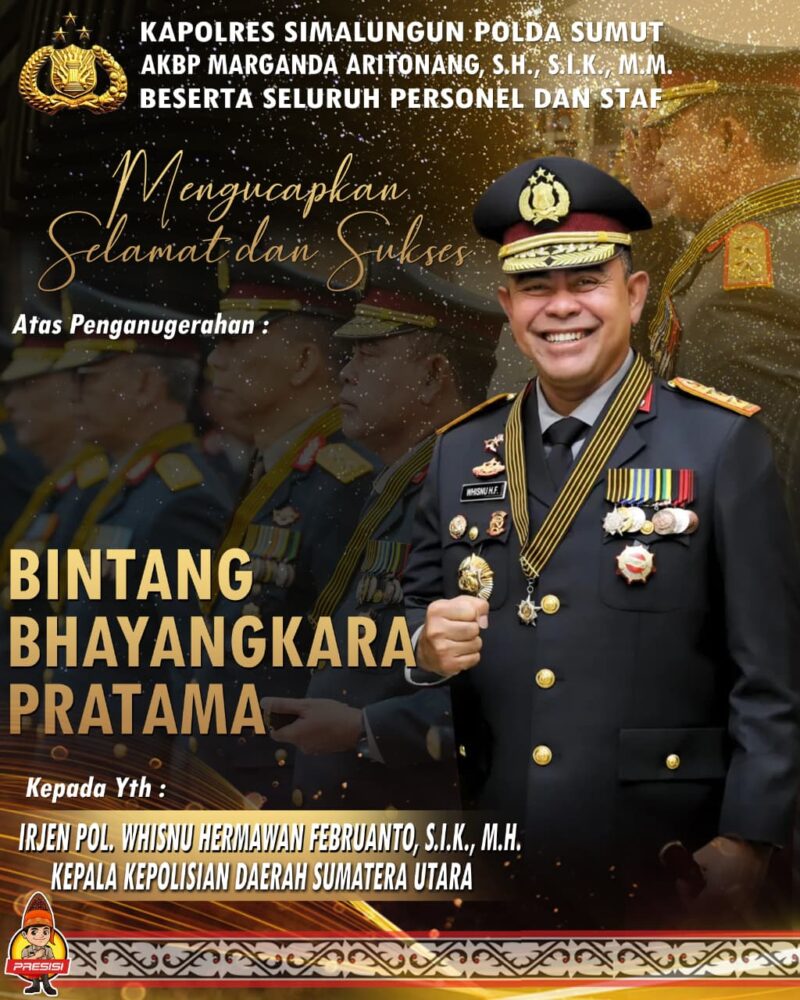 BATU BARA — Kapolres Batu Bara AKBP Doly Nelson H. Nainggolan, berserta seluruh personel Polres Batu Bara  dengan penuh kebanggaan menyampaikan ucapan selamat dan sukses atas penganugerahan Tanda Kehormatan Bintang Bhayangkara Pratama kepada Kepala Kepolisian Daerah Sumatera Utara Polda Sumut  Irjen Pol. Whisnu Hermawan.