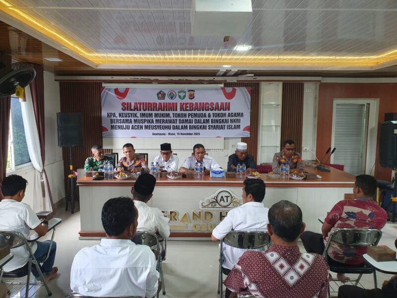Pidie – Kegiatan Silaturahmi Kebangsaan berlangsung khidmat dan penuh kebersamaan di dua kecamatan Geumpang–Mane, Kabupaten Pidie, pada Rabu 19 November 2025. Acara ini mempertemukan unsur Muspika, anggota KPA, para Keuchik, Mukim, tokoh agama, tokoh adat, tokoh masyarakat, serta para pemuda dalam satu momentum besar untuk memperkuat persatuan dan merawat perdamaian dalam bingkai Negara Kesatuan Republik Indonesia.