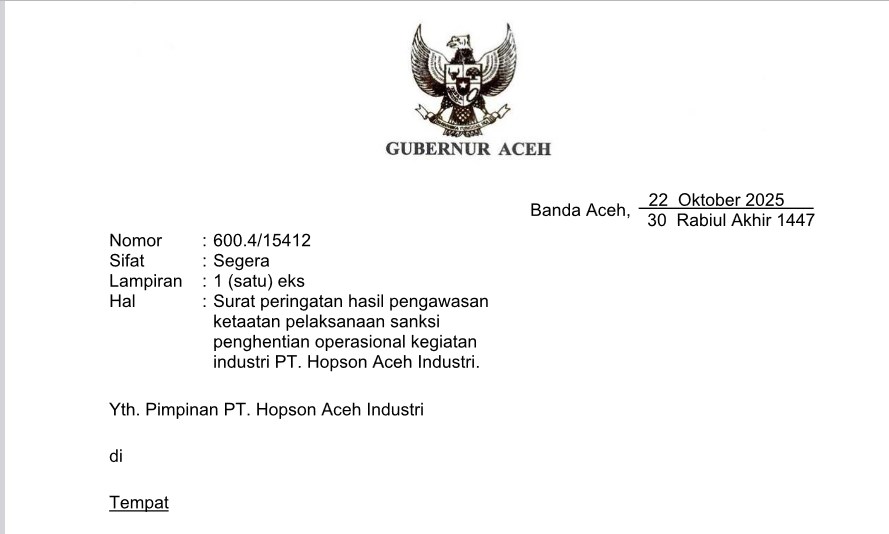 Surat peringatan serupa juga dilayangkan kepada PT. Hopson Aceh Industri dalam dokumen bernomor 600.4/15412 pada tanggal yang sama, 22 Oktober 2025. Berdasarkan hasil pengawasan pasca-terbitnya surat Gubernur Aceh Nomor 500.4/4734 tanggal 25 April 2025, PT. Hopson Aceh Industri juga kedapatan belum mematuhi kewajiban penghentian operasional. Bahkan, perusahaan terus beroperasi tanpa memiliki izin pengolahan hasil hutan bukan kayu, termasuk dokumen UKL-UPL baru yang sesuai dengan kapasitas produksi aktual. Lebih parah, dokumen PKPLH yang digunakan diterbitkan oleh otoritas yang tidak sesuai berdasarkan pendelegasian kewenangan.