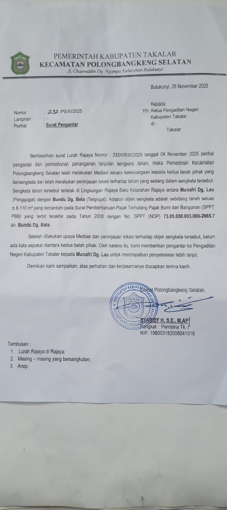 Takalar l Waspadaindonesia.com – Kasus sengketa yang melibatkan dua warga di Kelurahan Rajaya, Kecamatan Polongbangkeng Selatan (Pol-Sel), Kabupaten Takalar, semakin memanas. Lurah Rajaya dan Camat Pol-Sel diduga kuat telah melakukan keberpihakan terhadap salah satu pihak, sehingga menghambat penyelesaian kasus secara objektif di tingkat bawah.(27/11/2025)