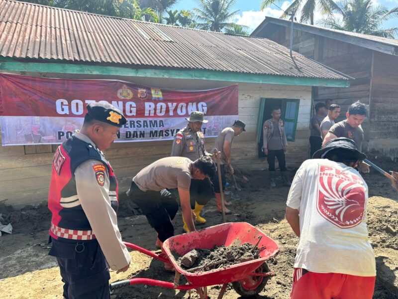 Dalam kegiatan tersebut, personel Polres Gayo Lues, Polsek Rikit Gaib dan Brimob bersama warga bergotong royong membersihkan lumpur di dalam rumah, halaman, dan akses jalan desa guna mempercepat pemulihan lingkungan pascabencana.