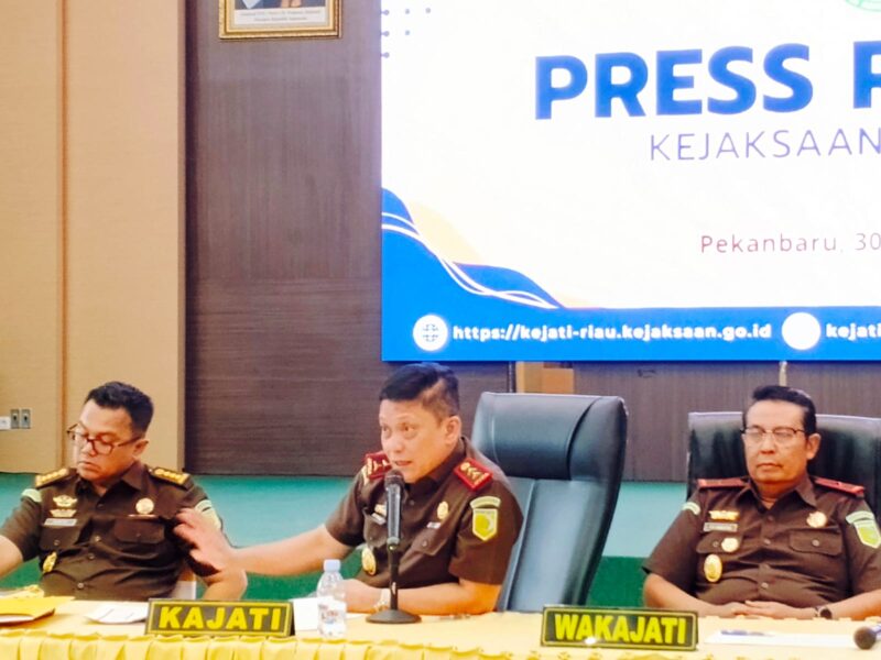 Pekanbaru,  waspadaindonesia.com – Kejaksaan Tinggi Riau menggelar Press Release Refleksi Akhir Tahun dengan memaparkan capaian kinerja sepanjang tahun 2025, bertempat di Aula Sasana H.M., Prasetyo, Gedung Satya Adhi Wicaksana Kejaksaan Tinggi Riau, Kota Pekanbaru, Provinsi Riau. Selasa (30/12/2025).Dalam kesempatan tersebut, Kepala Kejaksaan Tinggi Riau Dr. Sutikno, S.H., M.H., menyampaikan capaian kinerja sepanjang tahun 2025 pada masing- masing bidang yakni Pembinaan, Intelijen, Tindak Pidana Umum (Pidum), Tindak Pidana Khusus (Pidsus), Perdata dan Tata Usaha Negara (Datun), Tindak Pidana Militer (Pidmil), Pemulihan Aset dan Pengawasan.
