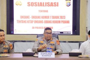 Kampar,  waspadaindonesia.com – Polres Kampar menggelar kegiatan sosialisasi Undang-Undang (UU) Nomor 1 Tahun 2023 tentang Kitab Undang-Undang Hukum Pidana (KUHP) & UU Nomor 20 Tahun 2025 tentang Kitab Undang-Undang Hukum Acara Pidana (KUHAP) kepada seluruh penyidik dan penyidik pembantu Sat Reskrim, Sat Res Narkoba, serta Unit Laka  Lantas  Polres  Kampar,  Senin (05/1/2026).Kegiatan yang dilaksanakan di Ruangan Gelar Sat Reskrim Polres Kampar ini, bertujuan untuk meningkatkan pemahaman penyidik dan penyidik pembantu tentang KUHP dan KUHAP yang baru, serta dapat menerapkannya dalam tugas penyidikan dan penyelidikan.