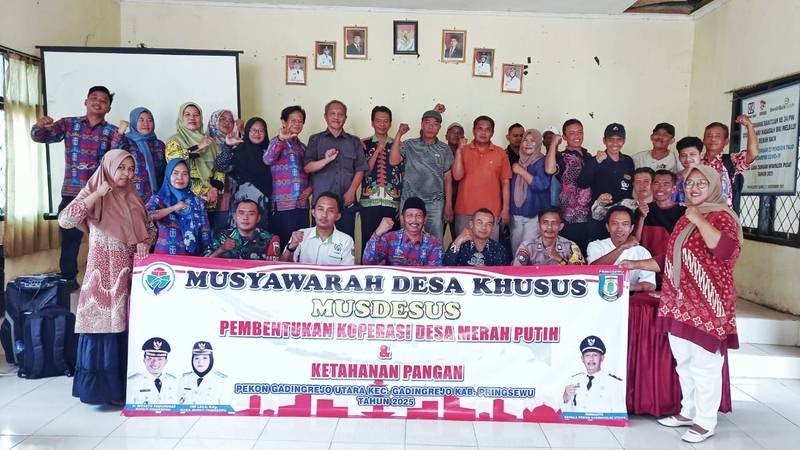 Pringsewu – Kepala Pekon Gading Rejo Utara, Kecamatan Gading, kabupaten Pringsewu, dalam Musyawarah Desa khusus (Musdesus) pembentukan koperasi merah putih (KMP). (Jum’at, 09/05/2025).