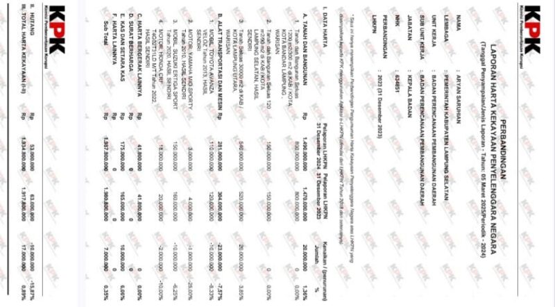 BANDAR LAMPUNG – Lembaga Swadaya Masyarakat (LSM) Amunisi Provinsi Lampung menyoroti adanya dugaan anomali dalam Laporan Harta Kekayaan Penyelenggara Negara (LHKPN) Aryan Saruhian, Kepala Badan Perencanaan Pembangunan Daerah (Bappeda) Kabupaten Lampung Selatan. LSM mendesak Komisi Pemberantasan Korupsi (KPK) dan Pusat Pelaporan dan Analisis Transaksi Keuangan (PPATK) untuk segera melakukan pemeriksaan mendalam.