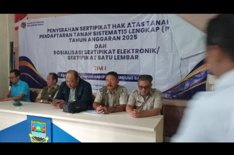 Bandung Barat,Waspadaindonesia.com // Komitmen pemerintah dalam memberikan kepastian hukum atas kepemilikan tanah terus diwujudkan secara nyata. Kantor Pertanahan Kabupaten Bandung Barat (BPN KBB) melalui Tim 1 Pendaftaran Tanah Sistematis Lengkap (PTSL) melaksanakan penyerahan sertipikat hak atas tanah Tahun Anggaran 2025 yang dirangkaikan dengan sosialisasi sertipikat elektronik satu lembar.