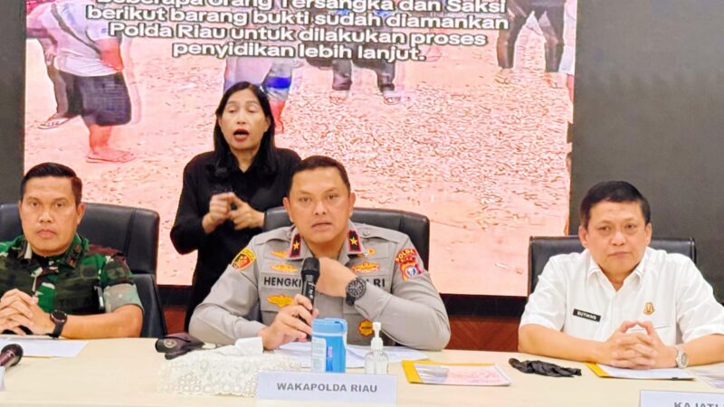 Pekanbaru, waspadaindonesia.com – Polda Riau menangkap enam orang tersangka terkait perusakan di Poskotis Taman Nasional Tesso Nilo, Kabupaten Pelalawan. Selain itu, Polda Riau juga menangkap tiga tersangka lain yang menguasai lahan 270 hektare untuk perkebunan sawit. Saat konferensi pers di-Mapolda Riau, pada hari Rabu (21/01/2026).Wakapolda Riau Brigjen Hengki Haryadi menjelaskan, tiga tersangka tersebut ditangkap atas tindak pidana Undang-undang Konservasi Sumber Daya Alam (KSDA). Ketiga tersangka masing-masing berinisial AMM, RPM, dan BSA.