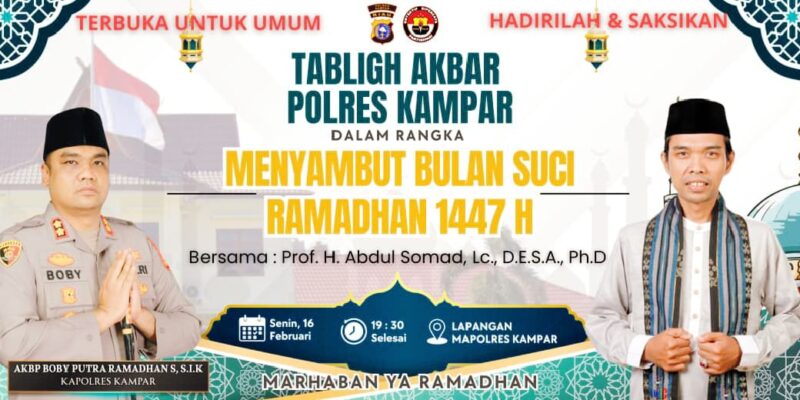 “Kami dari Polres Kampar mengajak seluruh masyarakat Kampar untuk menghadiri dan meramaikan kegiatan Tabligh Akbar ini. Kegiatan ini terbuka untuk umum,” ujar Kapolres Kampar AKBP Boby Putra Ramadhan Sebayang.
