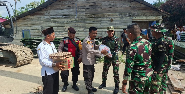 BATU BARA — Sebagai wujud dukungan terhadap pembangunan jembatan modular di Desa Sei Buah Keras, Kecamatan Medang Deras, Kabupaten Batu Bara, Kapolsek Medang Deras AKP A.H. Sagala memberikan sembako kepada prajurit TNI yang berjibaku membangun jembatan.
