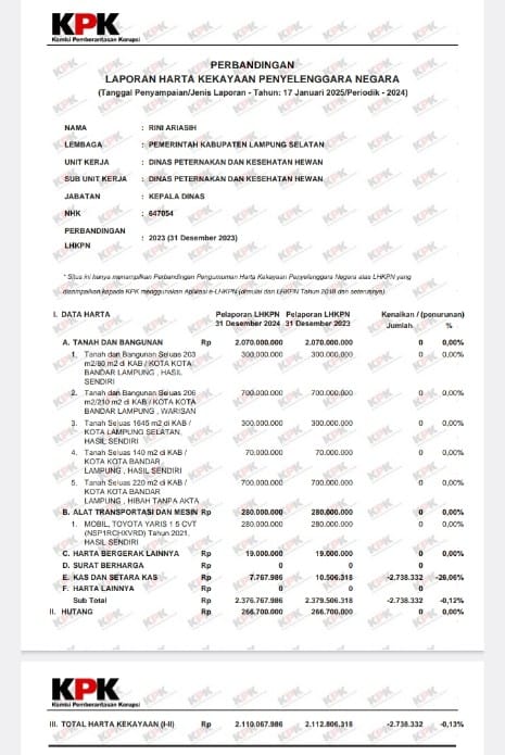 Kalianda, Lampung Selatan – LSM Jati Provinsi Lampung menyoroti adanya kejanggalan dalam Laporan Harta Kekayaan Penyelenggara Negara (LHKPN) Rini Ariasih, Kepala Badan Pengelolaan Keuangan dan Aset Daerah (BPKAD) Kabupaten Lampung Selatan. Sorotan ini menyusul perbandingan LHKPN yang dilaporkan saat menjabat sebagai Kepala Dinas Peternakan dan Kesehatan Hewan pada tahun 2024 dengan periode sebelumnya.