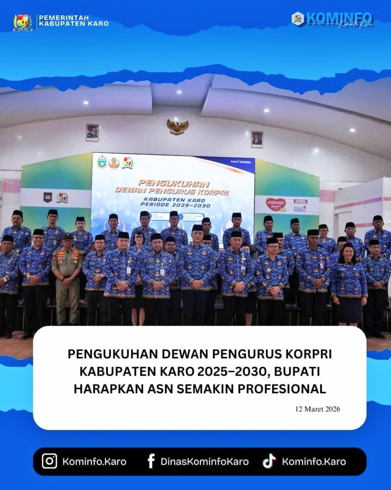 Dilaksanakan di Aula Rakoetta Brahmana, Kantor Bupati Karo, Kamis (12/03/26). Bupati Karo, Brigjen Pol (Purn) Dr. dr. Antonius Ginting, Sp.OG., M.Kes., yang diwakili Wakil Bupati Karo, Komando Tarigan, S.P., menghadiri kegiatan Pengukuhan Dewan Pengurus Korps Pegawai Republik Indonesia (KORPRI) Kabupaten Karo Masa Bakti 2025–2030, yang di kukuhkan oleh Sekretaris Daerah Provinsi Sumatera Utara selaku Ketua Dewan Pengurus KORPRI Sumatera Utara