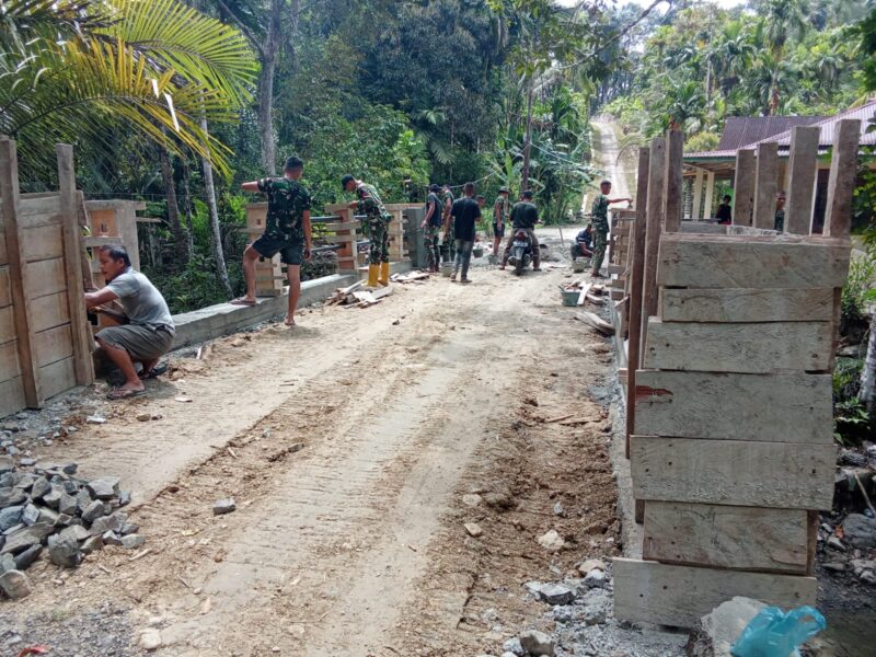 Kodim 0213/Nias menuntaskan pembangunan infrastruktur Jembatan Aramco di Sungai Malowu, Desa Sanawuyu, Kecamatan Sawo, Kabupaten Nias Utara, Jumat (13/3/26).