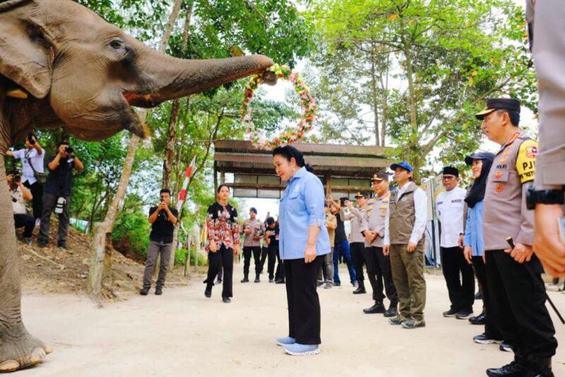 Kehadiran mereka disambut dengan atraksi unik berupa pengalungan bunga oleh salah satu gajah binaan TNTN kepada Titiek Soeharto.
