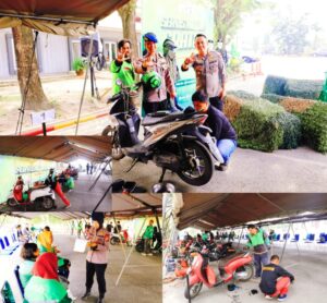 Pasukan ojol mengantre dengan tertib di tenda khusus service motor gratis yang sudah disediakan di lapangan Mako Brimob.