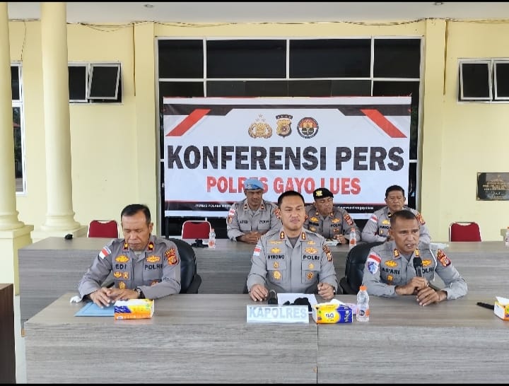Konferensi pers tersebut dipimpin langsung oleh Kapolres Gayo Lues AKBP Hyrowo, S.I.K., didampingi Wakapolres Kompol Edi Yaksa, S.Sos., serta Kasatlantas AKP As’ari, S.H.