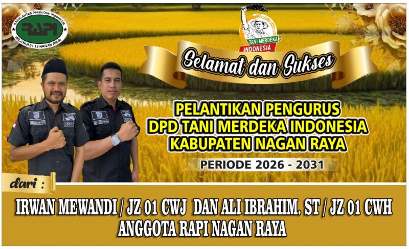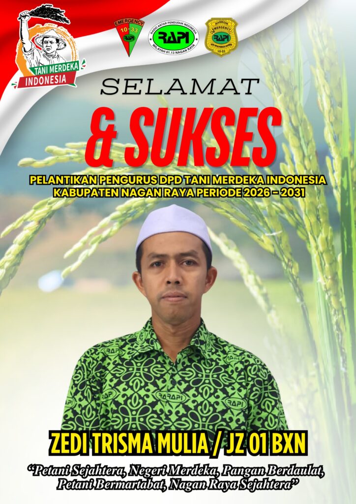 Suka Makmue : Radio Antar Penduduk Indonesia ( RAPI ) Wilayah 01.13 Kabupaten Nagan Raya Provinsi Aceh mengucapkan selamat kepada Ali Sadikin Nakhodai TMI Nagan Raya masa periode 2026 – 2031. dan juga selamat kepada Ketua RAPI Nagan Raya JZ 01 AGE ( Agussalim.RZ.S.Sos) sebagai Sekretaris DPD TMI Nagan Raya dan seluruh Pengurus Tani Merdeka Indonesia Kabupaten Nagan Raya yang barusan di Lantik/ dikukuhkan oleh Ketua DPW TMI Aceh Cut Muhammad di Aula SKB Suka Makmue Nagan Raya pada hari Senin 20 April 2026.