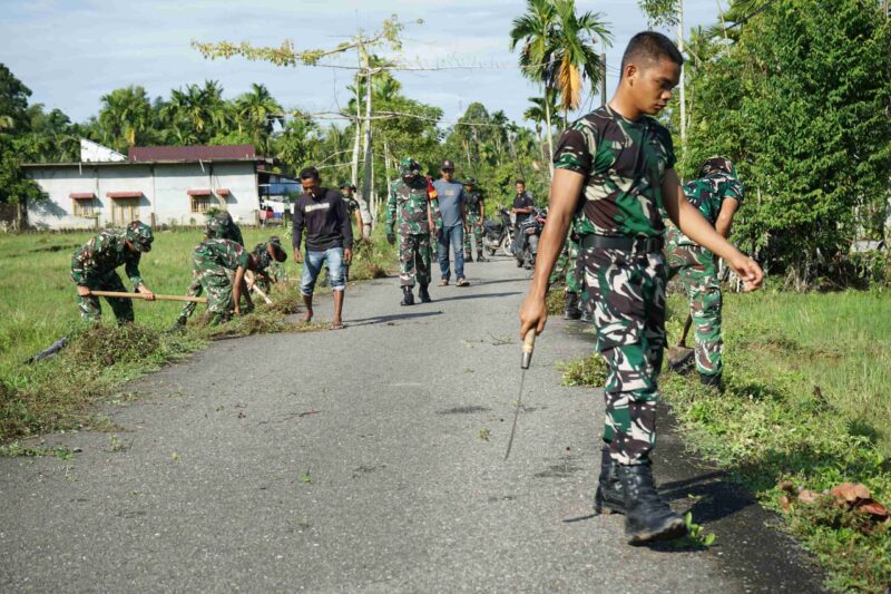 1. WaspadaIndonesia –  Memanfaatkan momentum hari libur aktivitas pada Jumat, Satuan Tugas (Satgas) TNI Manunggal Membangun Desa (TMMD) ke-128 Kodim 0110/Abdya menggelar gotong royong membersihkan bahu jalan serta lokasi kenduri tradisi desa “syukuran bungong kayee” di Desa Gunung Cut, Kecamatan Tangan-Tangan, Jumat (24/4/2026).