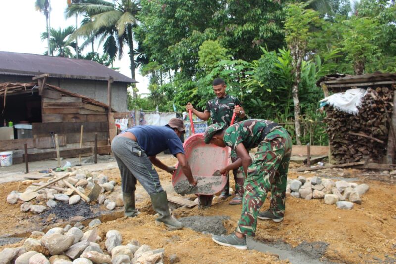 Kebersamaan antara personel TNI dan warga terlihat dalam setiap tahapan pembangunan, mulai dari pengerjaan pondasi hingga struktur dasar bangunan.