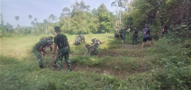 Dengan penuh semangat kebersamaan, personel TNI dan warga bahu-membahu membersihkan lahan dari semak belukar dan tanaman liar. Lahan tersebut nantinya akan dimanfaatkan sebagai area produktif guna mendukung kebutuhan pangan masyarakat setempat.