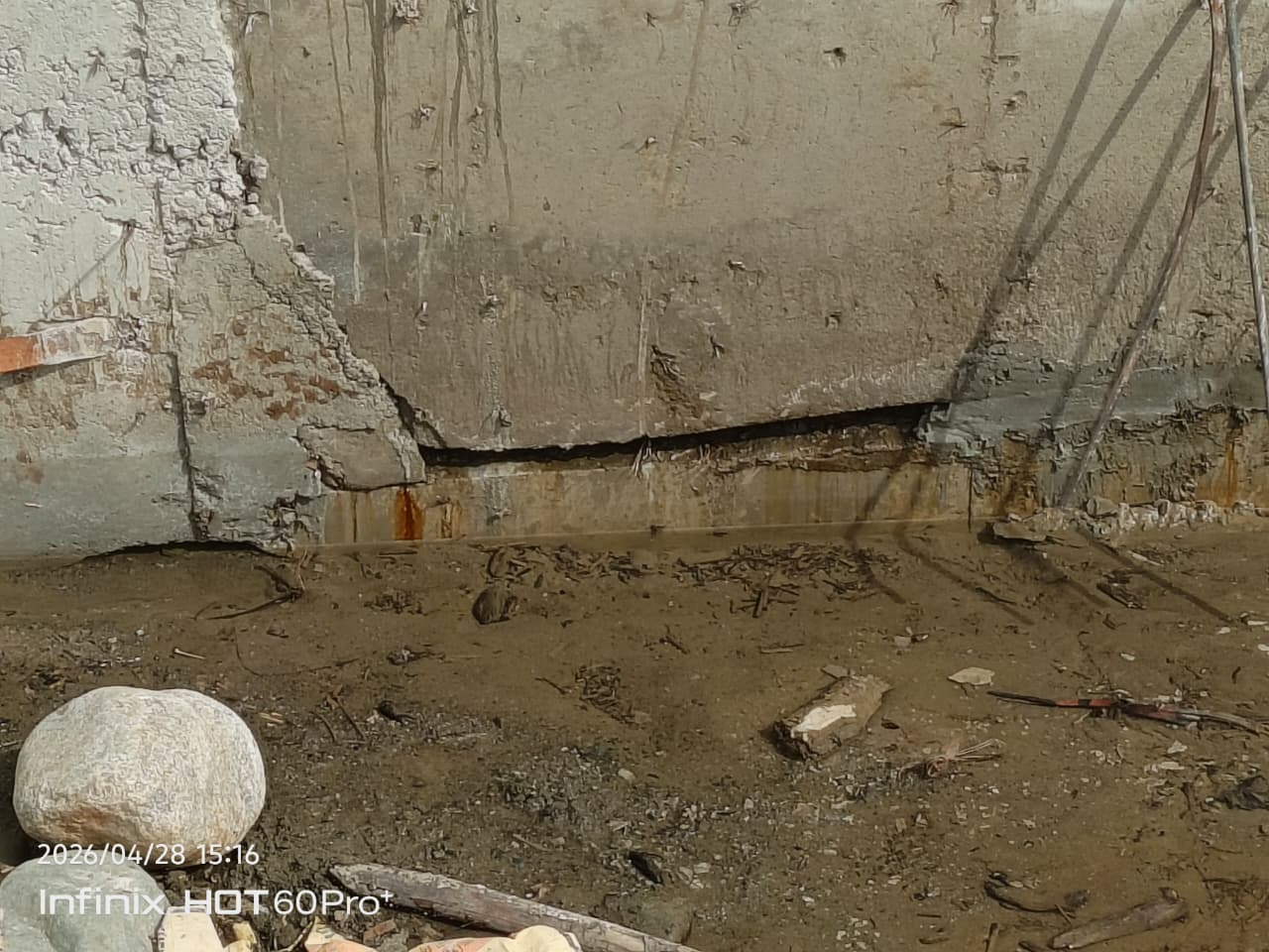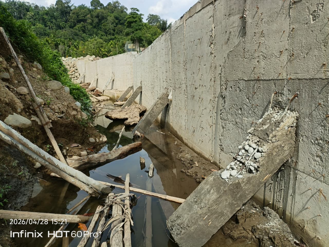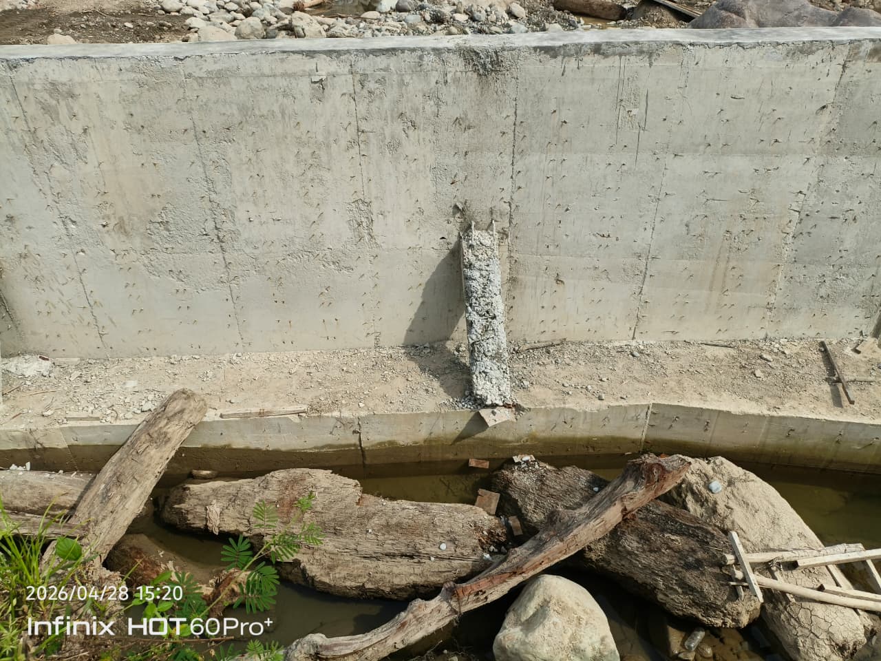 Pantauan lapangan memperlihatkan kualitas pengecoran yang buruk pada bagian dinding beton irigasi. Pekerjaan tampak tidak rapi dan permukaan beton dipenuhi retakan. Lapis semen tipis sekadarnya menutupi struktur yang sebelumnya terdampak banjir, tanpa perbaikan signifikan pada bagian yang beresiko. Tak hanya pada dinding, bagian bawah irigasi juga ditemukan retakan di sejumlah titik, menandakan lemahnya rekatan struktur dan berpotensi menyebabkan kerusakan lebih besar ketika debit air meningkat.