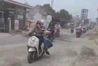 BANYAK DEBU – Seorang pengendara motor menutup hidup dengan jilbab karena banyak debu berterbangan di jalanan, Sabtu (28/3/2026). Debu ini akibat mandeknya perbaikan Jalan…