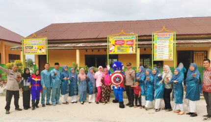 KAMPAR Kapolsek Tambang Kawal Superhero Bagi Makanan Bergizi Dengan kostum Unik